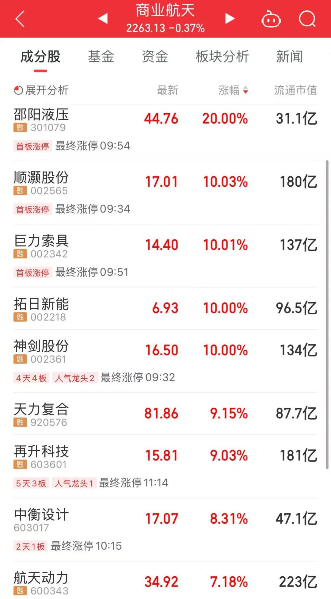 今天上午,商业航天板块一度冲高,顺灏股份、巨力索具等个股涨停。
